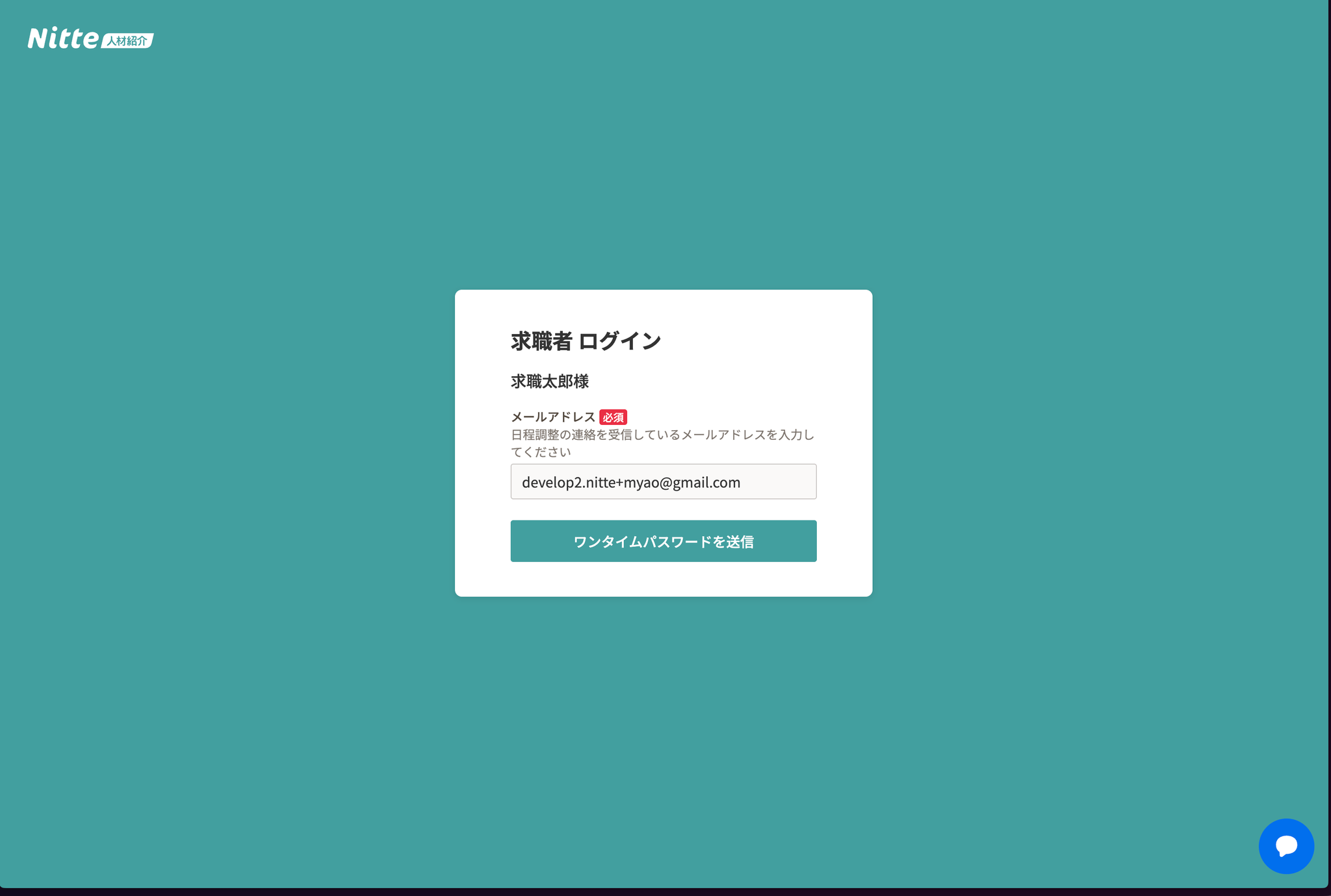 - 日程調整の連絡を受信しているメールアドレス*を入力します。ワンタイムパスワードが送信を押すとワンタイムパスワードが送信されます。