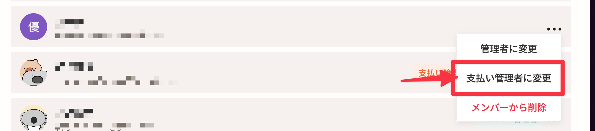 新しく支払い管理者にしたいユーザーを選んで、